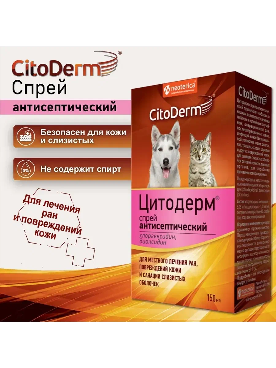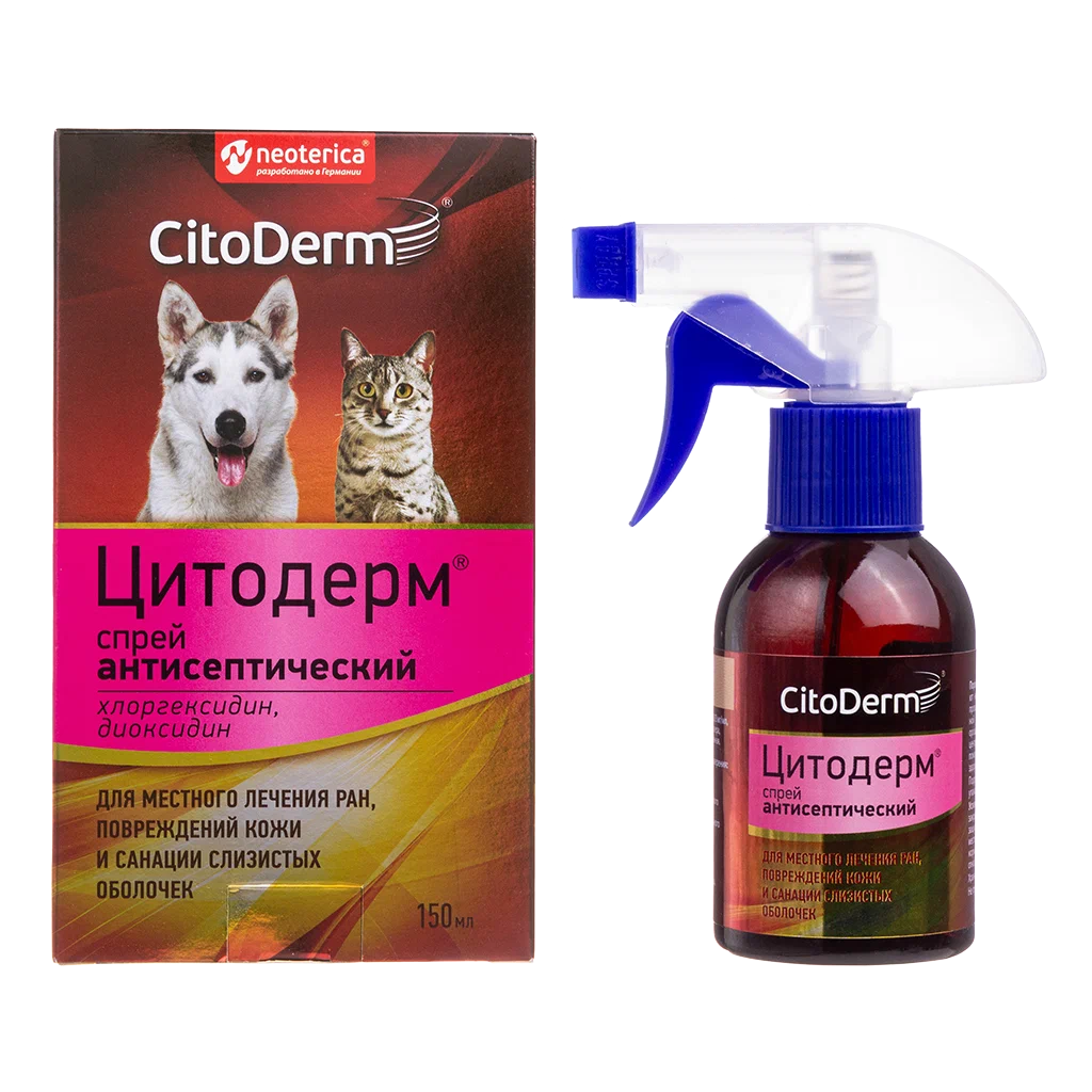 Спрей- для кошек и собак. В составе хлоргексидин и диоксидин. Для местного лечения ран, повреждений кожи и санации слизистых оболочек. 150 мл.