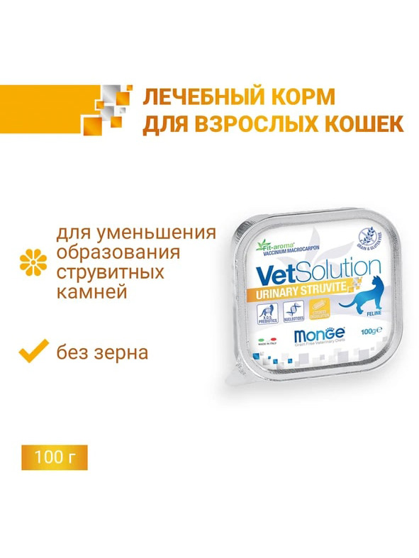 Лечебный корм Monge VetSolution Cat Urinary Struvite Уринари Струвит для кошек при заболеваниях мочеполовой системы, таких как идиопатический цистит (синдром болезненного мочевого пузыря, интерстициальный цистит) и струвитное течение мочекаменной болезни (струвитная кристаллурия и уролитиаз).