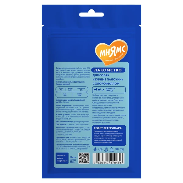 Мнямс ДЕНТАЛ "Зубные палочки" с хлорофиллом – вкусное и полезное лакомство для взрослых собак и щенков старше 3-х месяцев. Обладают высокой вкусовой привлекательностью, предотвращают появление зубного налета, обеспечивают деликатный массаж десен. Благодаря хлорофиллу в составе, способствуют снижению кровоточивости десен, дезодорирует полость рта и освежают дыхание.