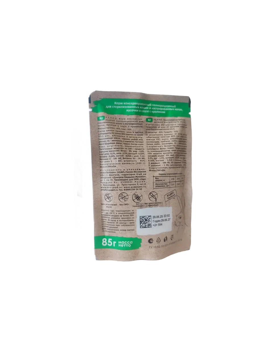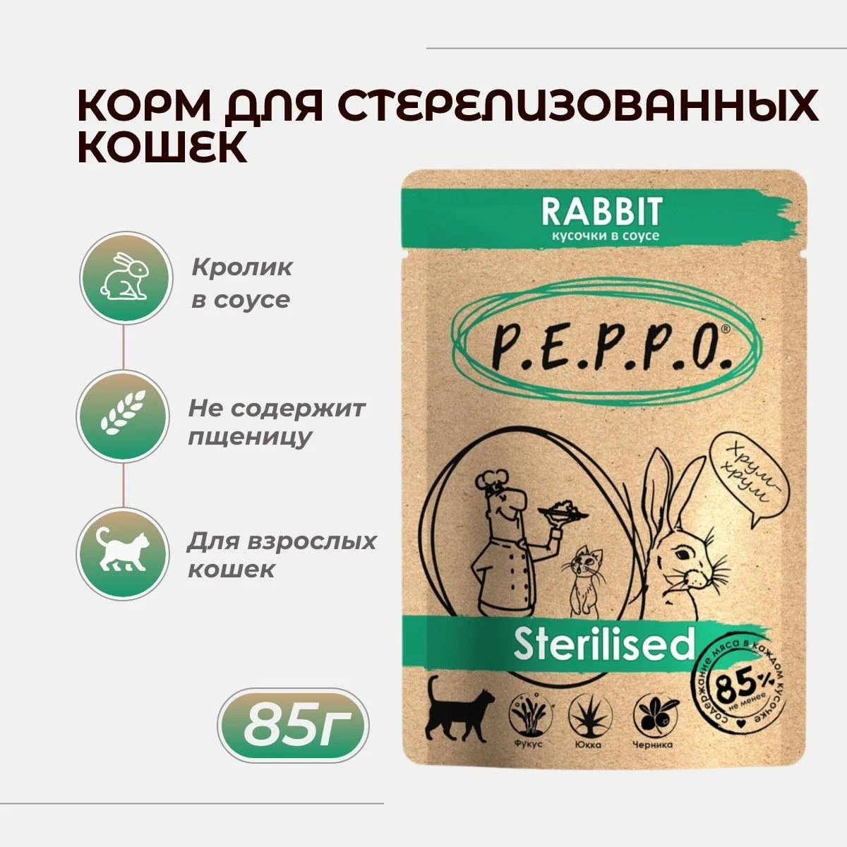 ПЕППО, пауч д/кош , д/стерил Кролик соус 85гр (Индейка, Лосось)