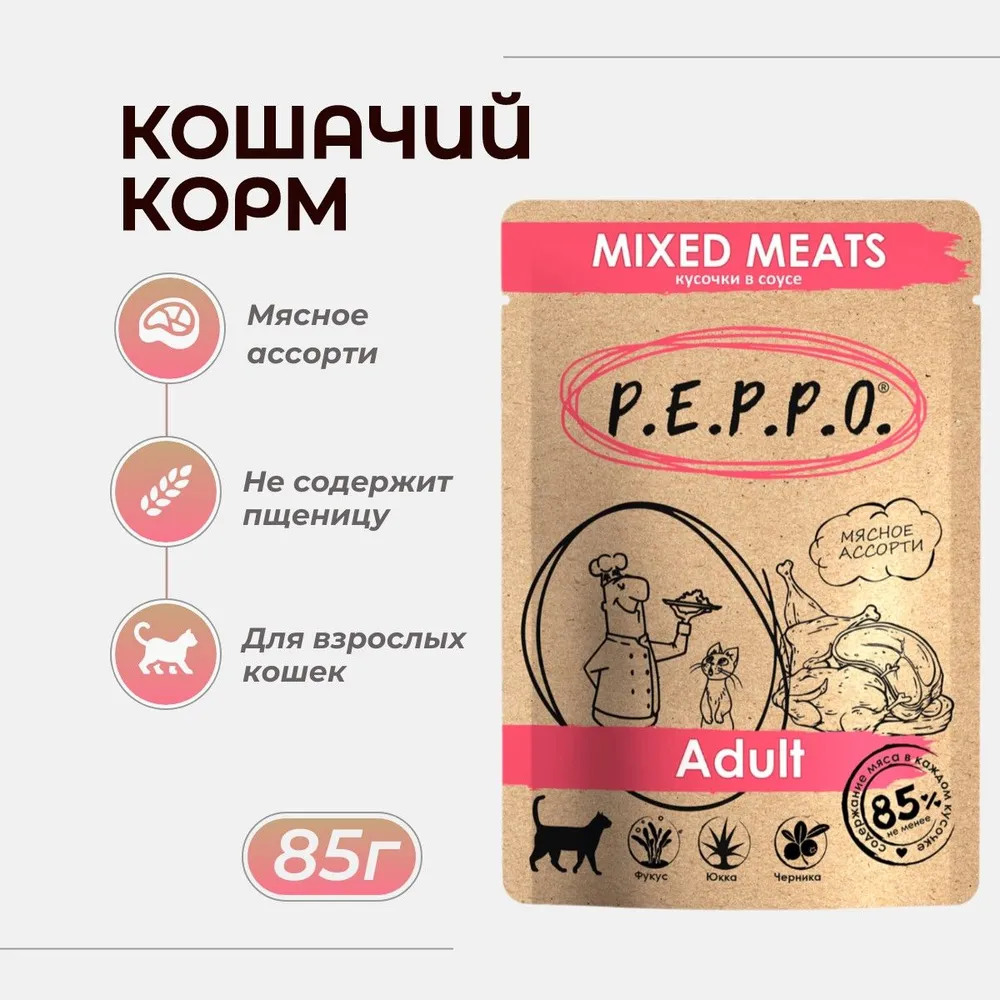 Пеппо, консервированный корм для взрослых кошек, кусочки в соусе с мясным ассорти