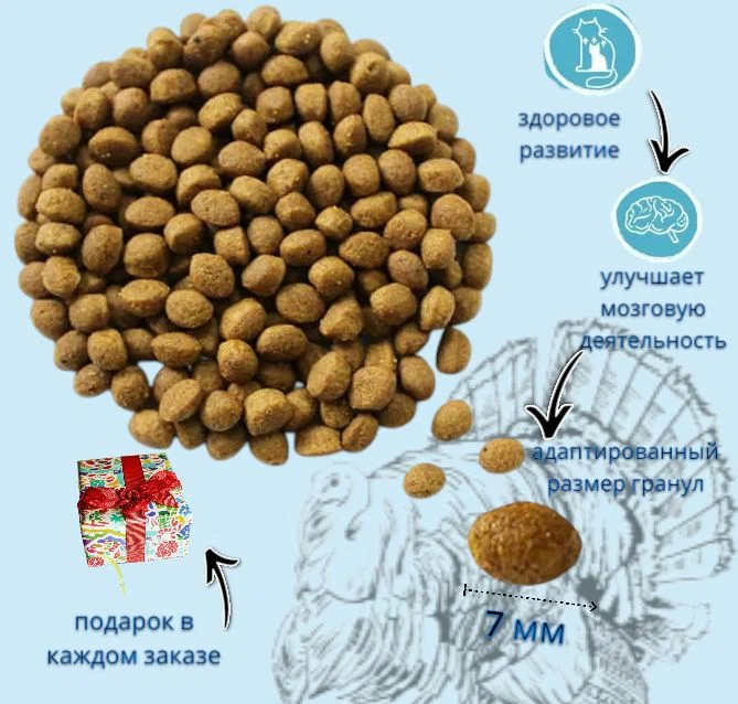 Мясо индейки хорошо усваивается и обеспечивает легкий переход к твердой пище, что очень важно для котят.
