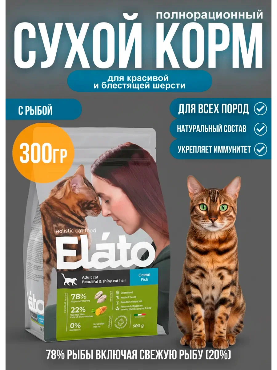 Elato Holistic сух д/кош 0,300 д/взр Рыба д/красивой/блестящей шерсти
