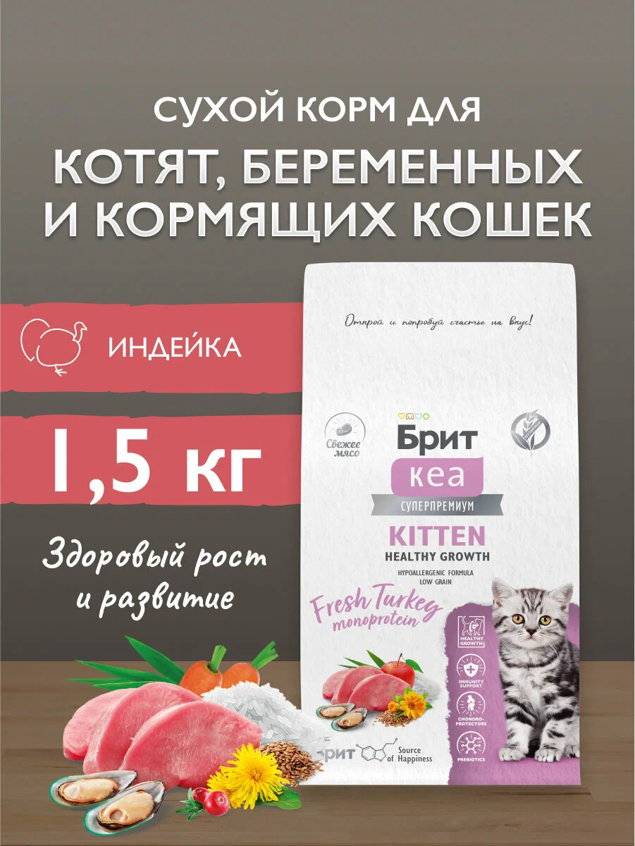 Полнорационный сухой корм суперпремиум-класса с индейкой для котят, беременных и кормящих кошек. Главные компоненты для здоровья котят — это белки и жиры.