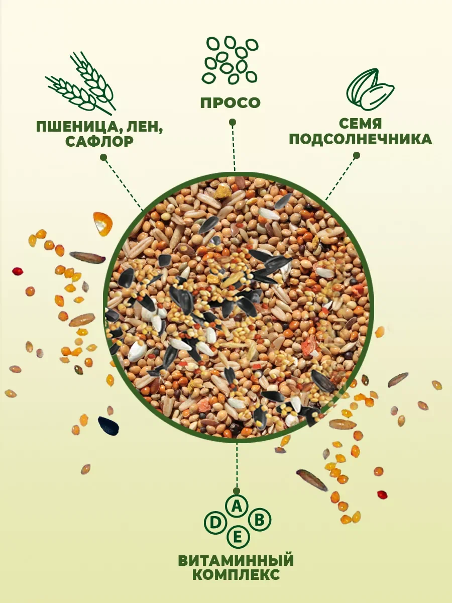 Состав *Просо желтое, просо красное, просо белое, овес, подсолнечник,пшеница, лен, витаминный комплекс.