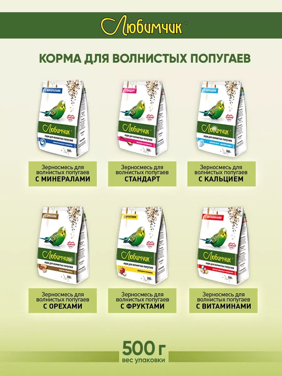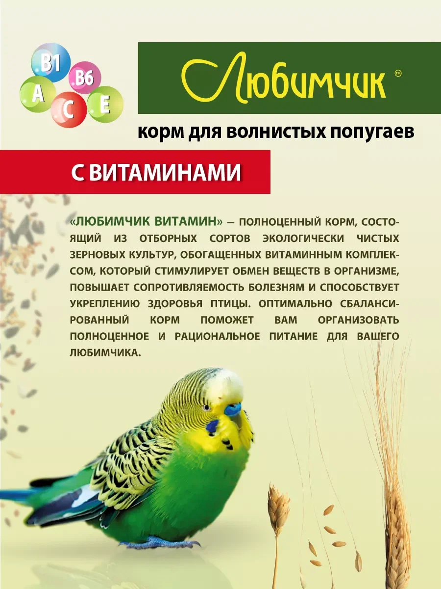 "Любимчик - корм с добавлением витаминного комплекса для волнистых попугаев. Повышает сопротивляемость болезням и способствует укреплению здоровья.