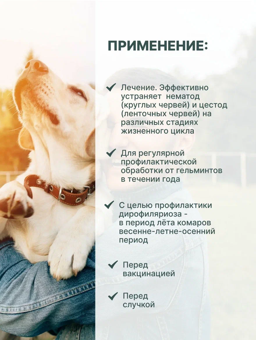 Для собак с лечебной и профилактической целью при нематодозах, цестодозах и ассоциативных нематодо-цестодозных инвазиях, вызванных гельминтами .