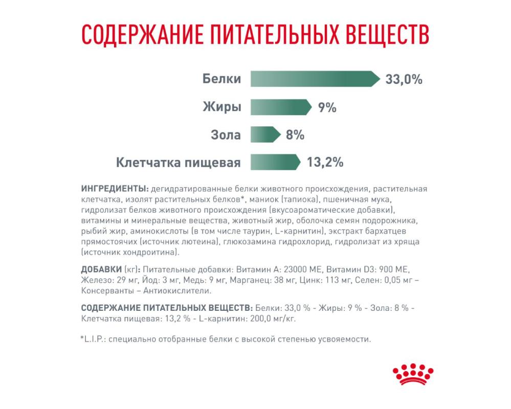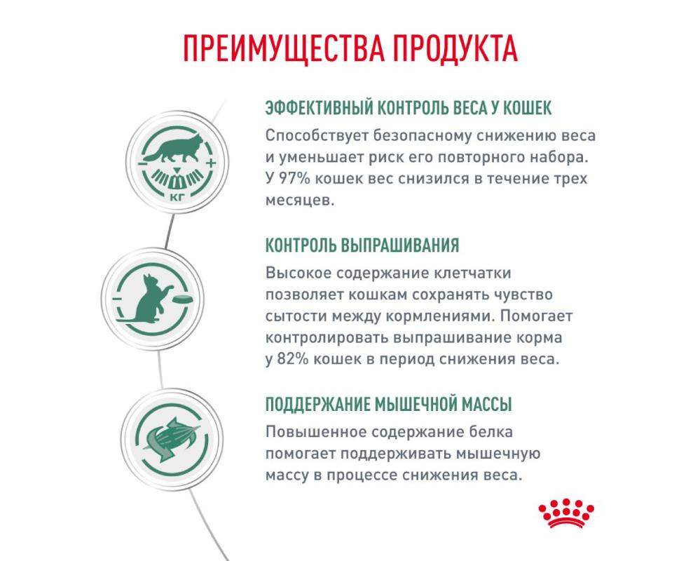 Состав корма содержит повышенное количество клетчатки, что способствует быстрому насыщению. Высококачественный белок обеспечивает длительное чувство сытости, помогая кошке комфортно переносить перерывы между кормлениями - особенно важный аспект при диетическом питании.