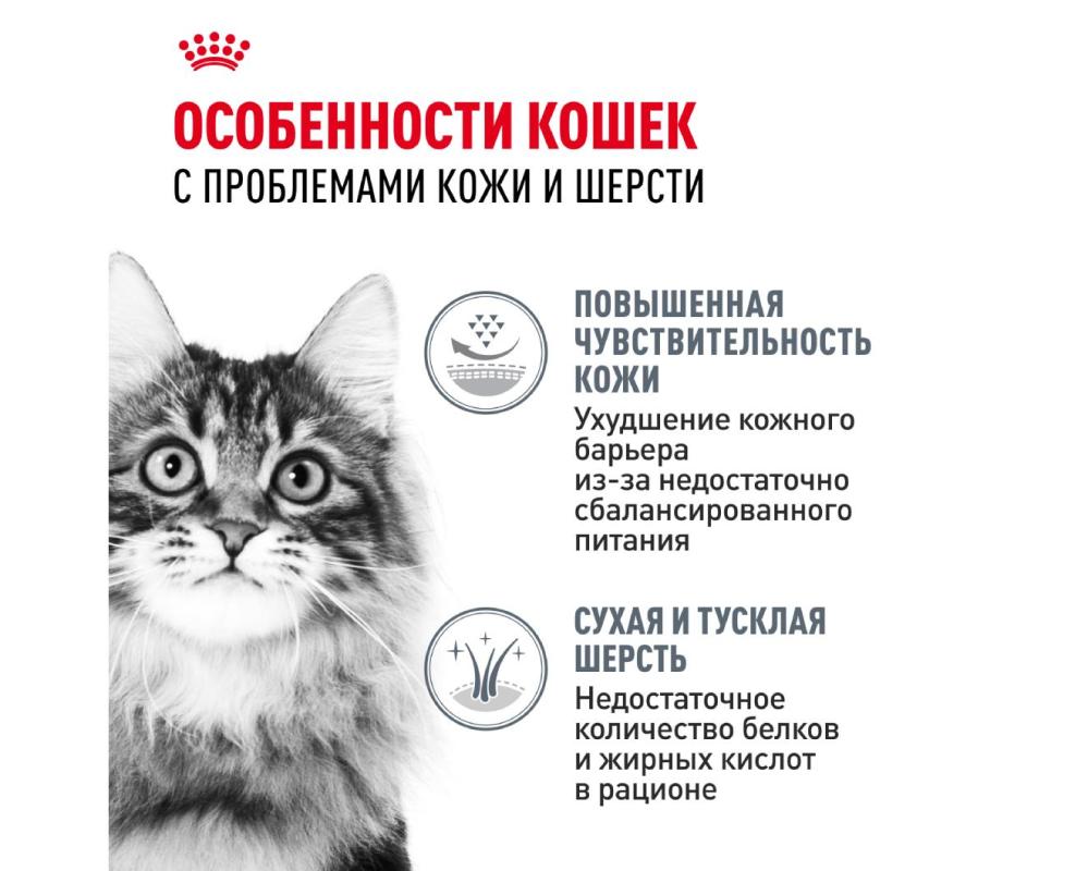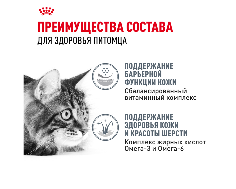 Формула ROYAL CANIN® Hair & Skin Care поддерживает здоровье кожи и красоту шерсти, а также способствует нормальному функционированию мочевыделительной системы. Клетки кожи постоянно обновляются и нуждаются в питательных веществах, а повышенная чувствительность кожи может ухудшать качество шерсти.