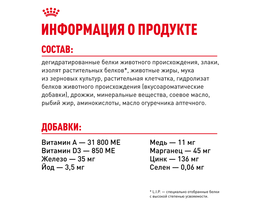 Корм также включает комбинацию витаминов группы В, серосодержащих аминокислот, цинка и меди, которые поддерживают барьерную функцию кожи и служат строительным материалом для шерсти. Высококачественные белки L.I.P.* способствуют росту здоровой и красивой шерсти.