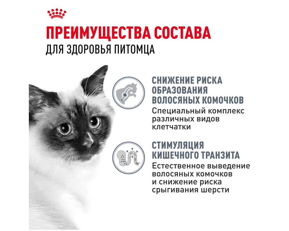 Формула ROYAL CANIN® Hairball Care стимулирует выведение волосяных комочков и поддерживает здоровье пищеварительной и мочевыделительной систем. Кошки уделяют много времени уходу за шерстью, и в процессе вылизывания могут проглатывать большое количество выпавших волос, которые скапливаются в желудочно-кишечном тракте, формируя волосяные комки.