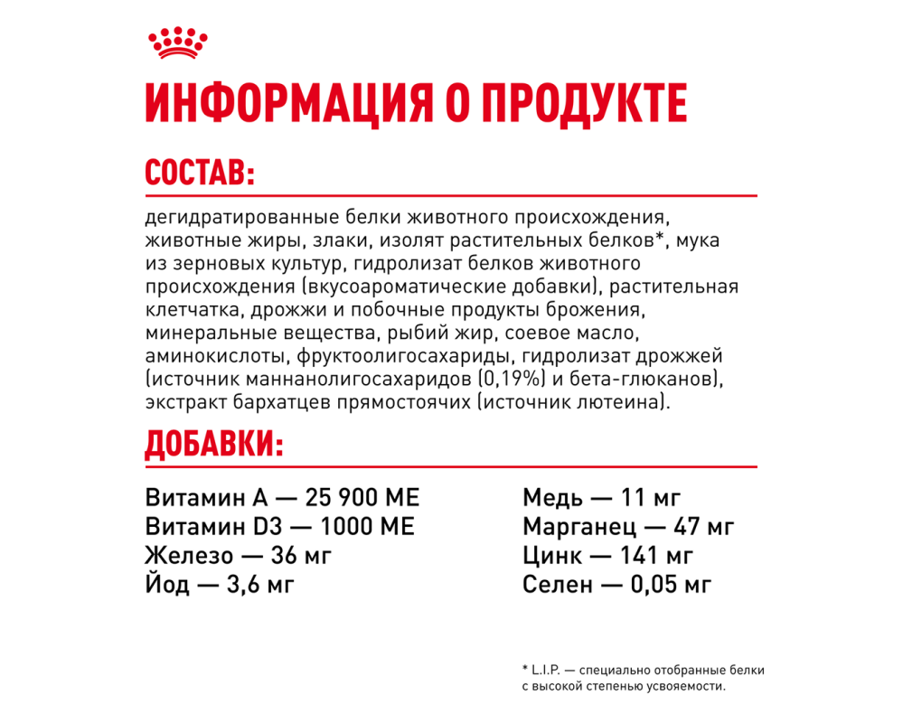 Формула ROYAL CANIN® Mother & Babycat поддерживает здоровье как кошки, так и котят, укрепляет иммунитет, способствует здоровому пищеварению и развитию мозга котят, а также облегчает процесс отъема. Содержащиеся в рационе пребиотики (ФОС и МОС) и высококачественные белки L.I.P.* легко усваиваются, что поддерживает оптимальное пищеварение и позволяет котятам эффективно усваивать питательные вещества.