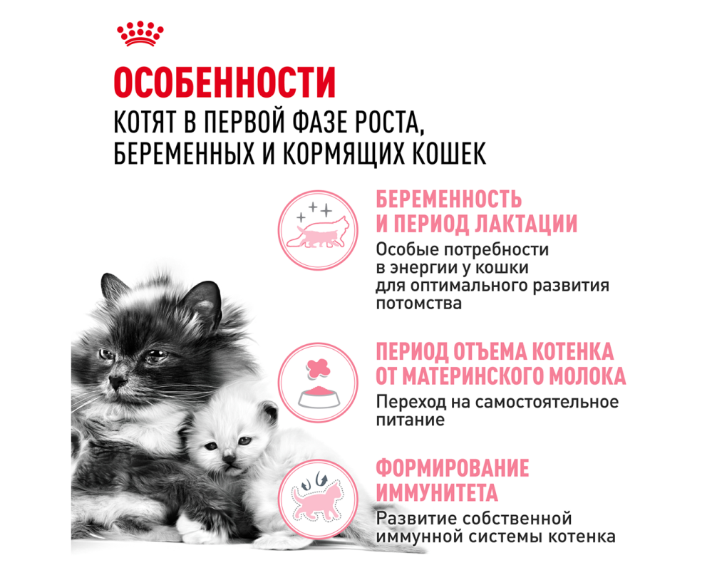 Корм сухой полнорационный для беременных и кормящих кошек, а также для котят в возрасте от 1 до 4 месяцев MOTHER & BABYCAT (МАЗЭ ЭНД БЭБИКЭТ) ROYAL CANIN® специально разработан с учетом потребностей матери и котенка в питательных веществах 400г