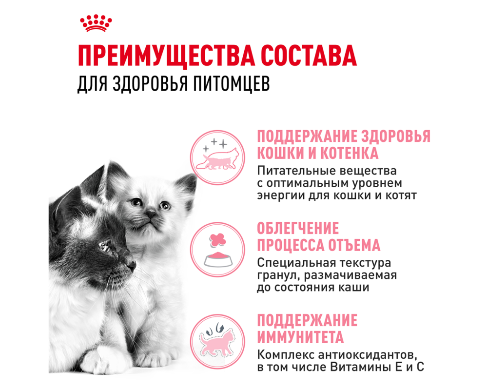 Иммунная система вашего котенка развивается постепенно, поэтому ROYAL CANIN® Mother & Babycat содержит эффективный комплекс антиоксидантов, включая витамины С и Е, для поддержания естественной защиты в период формирования иммунной системы. Это особенно важно в первые месяцы жизни, когда котята наиболее уязвимы.